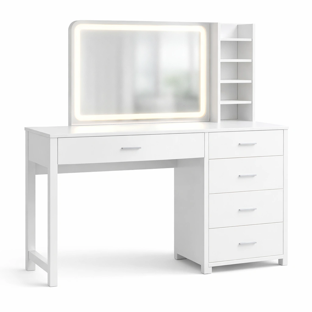 Este tocador está fabricado con MDF en color blanco. Incluye un espejo de vidrio templado con iluminación LED integrada. El tocador mide 120 cm de largo, 45 cm de ancho y 140 cm de alto contando el espejo. El peso neto es de 28 kg.